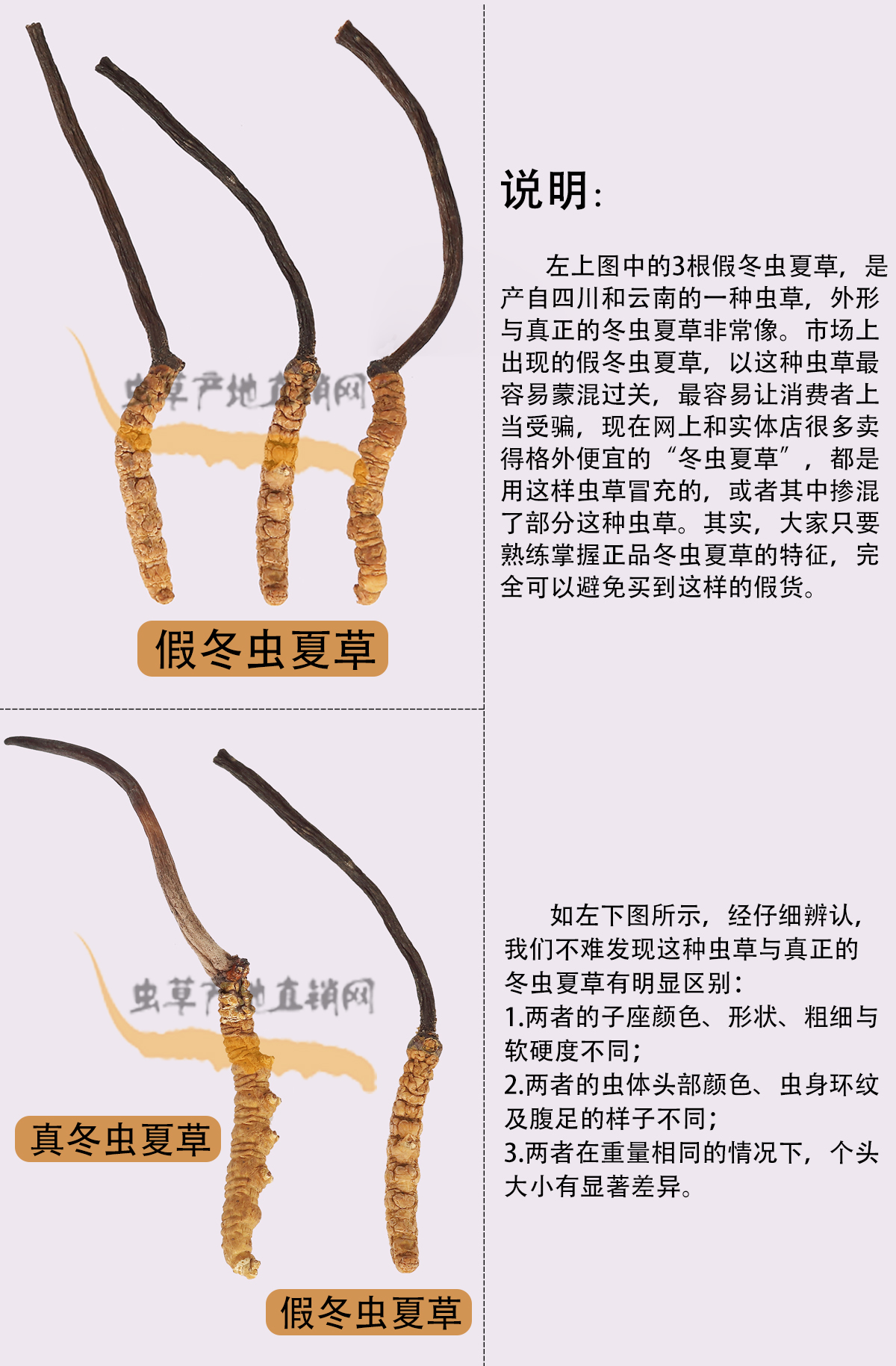 以上圖片,將這種產(chǎn)自四川和云南、極易被不法商家用來冒充正品的假冬蟲夏草與真冬蟲夏草的外形特征區(qū)別,介紹得非常清楚,相信大家在認真看過之后,就能避免買到這種假蟲草了。